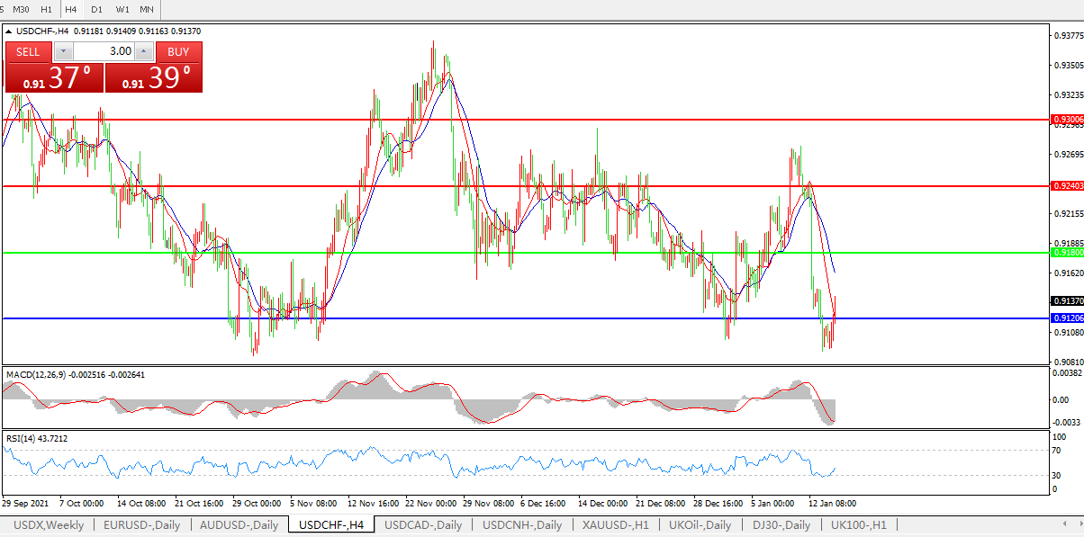 交易策略:0.9180下方看跌,目标0.9120、0.9040