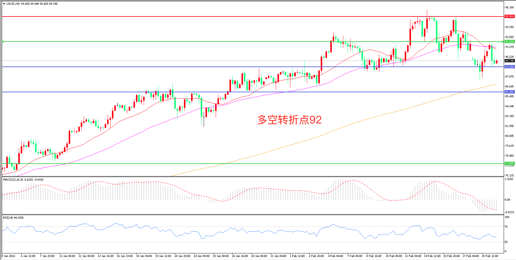 4小时图看,油价回踩89美元一线后再度拉升,短线走势偏强,92美元成为多空分水岭,均线系统粘合形成阻力,MACD绿柱缩短,RSI指标走平,日内延续震荡概率较大。