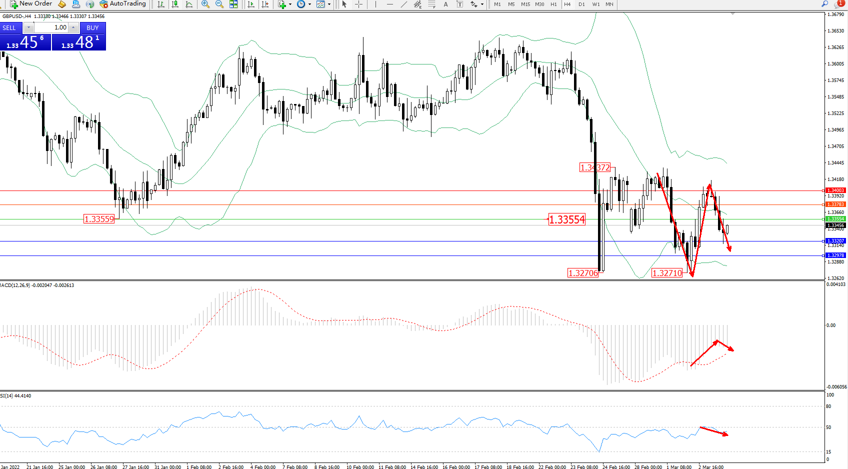 交易策略:1.33554下方看跌,目标1.33207、1.32978