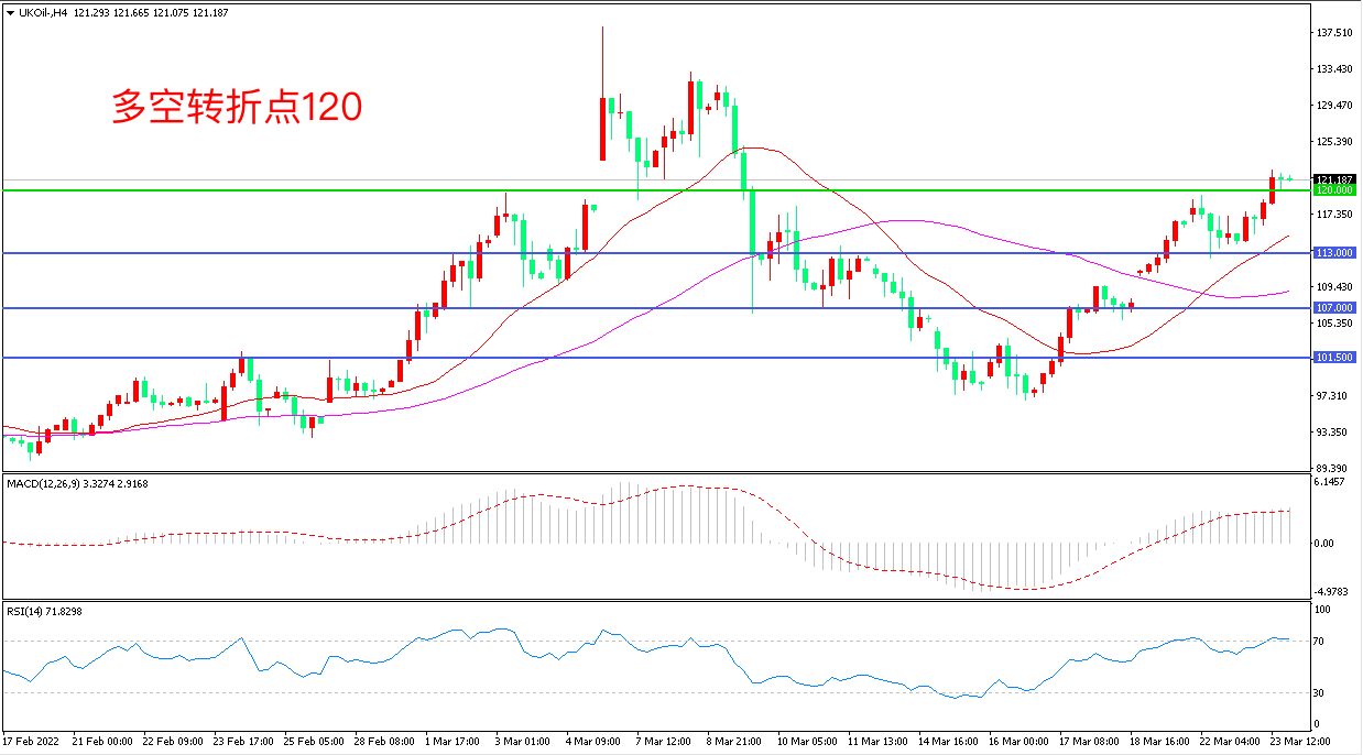 周三(3月23日),乌克兰谈判代表周三称俄乌谈判遇到“重大困难”而里海因罕见的风暴破坏,已暂停向管道输油,原油供应可能会减少多达100万桶/天,占全球原油产量的1%。,布伦特原油大幅拉升,收报121.18美元/桶。今晚拜登将参加北约特别峰会和欧洲理事会峰会,届时可能会宣布对俄罗斯实施更多的制裁,如果俄乌局势进一步恶化,油价可能还会飙升。