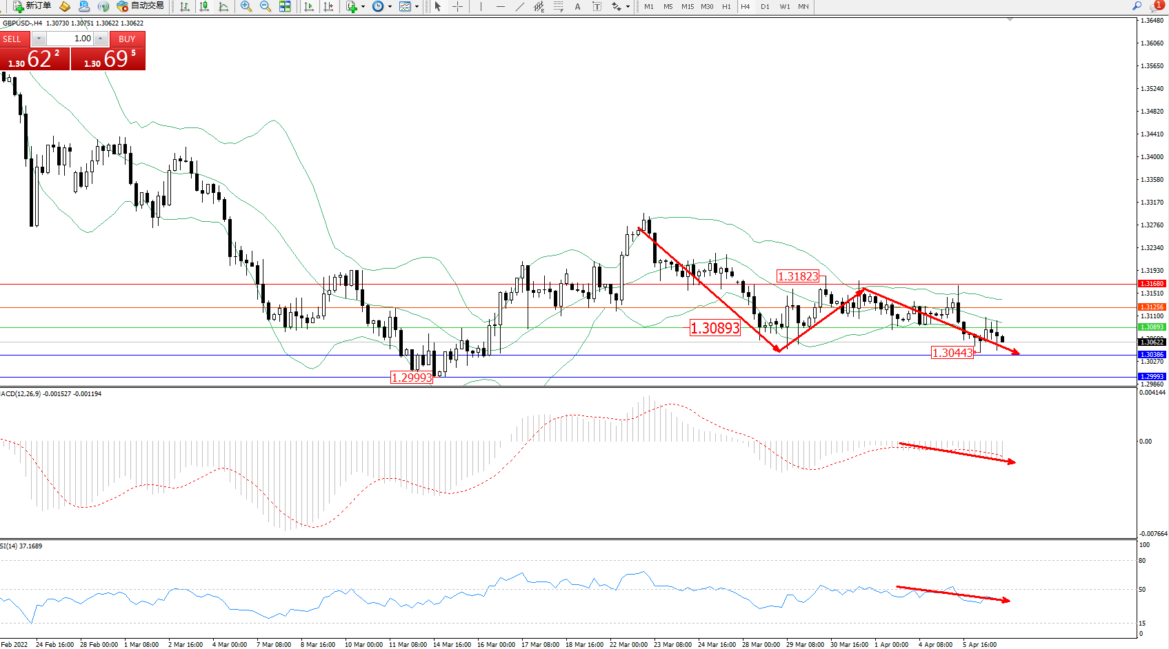 技术点评:空头动力延续布林带指标通道内维持震荡下行,低位抵达1.30443附近节点后不断震荡向下移动中,短期空头跌势未见止步迹象,布林带指标呈缓慢张口走势中,MACD指标处于0轴线下侧维持弱势整理,RSI指标处于50均衡线下侧窄幅整理平移;