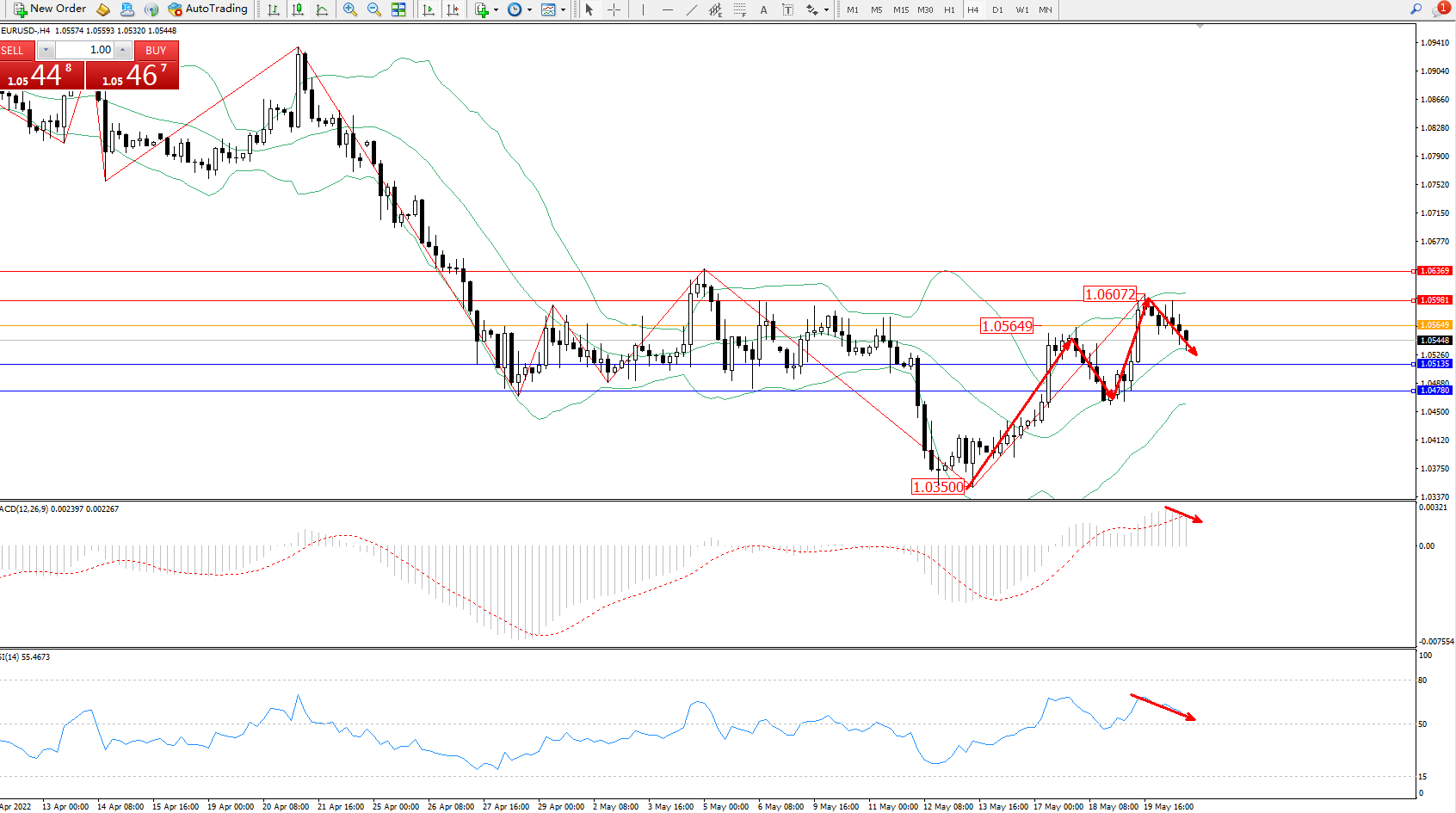 交易策略:1.05649下方看跌,目标1.05135、1.04780