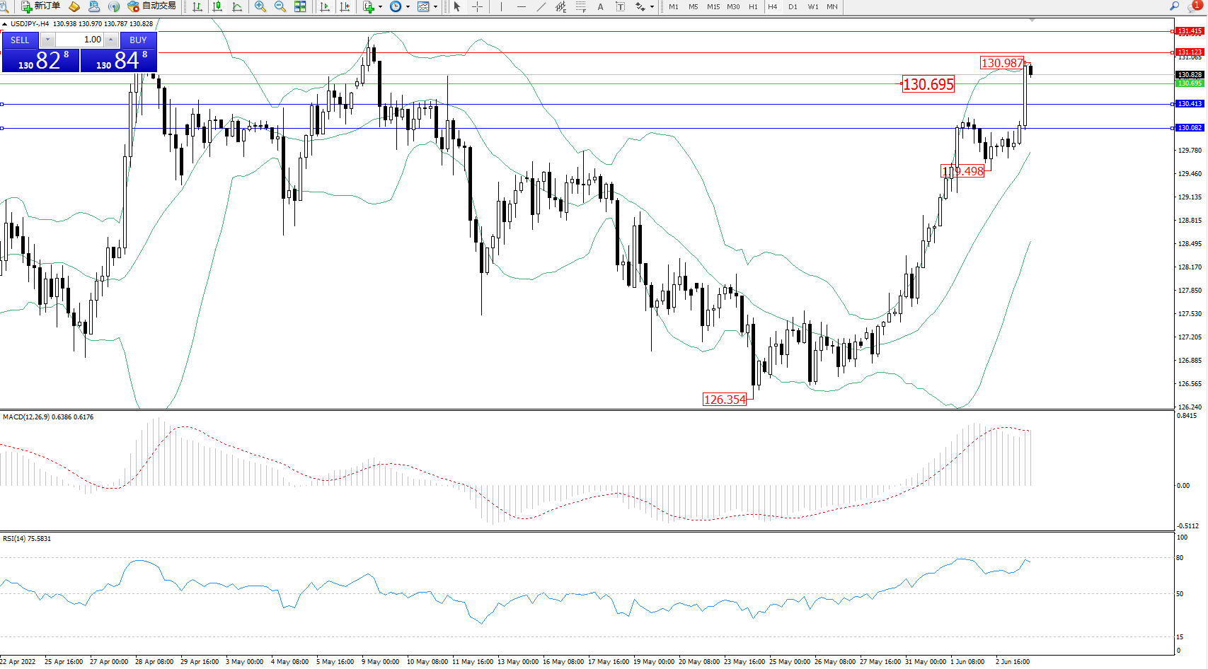 技术点评:多头动力延续布林带指标通道中上轨区间持续震荡上扬,高位触及上轨130.987附近节点后开始整理,短期多头拉升上扬走势或将延续,布林带指标呈收口不断拉升上扬中,MACD指标处于多头区域高位维持整理平移,RSI指标处于多头区域维持整理触及超买区80均衡线下侧徘徊;