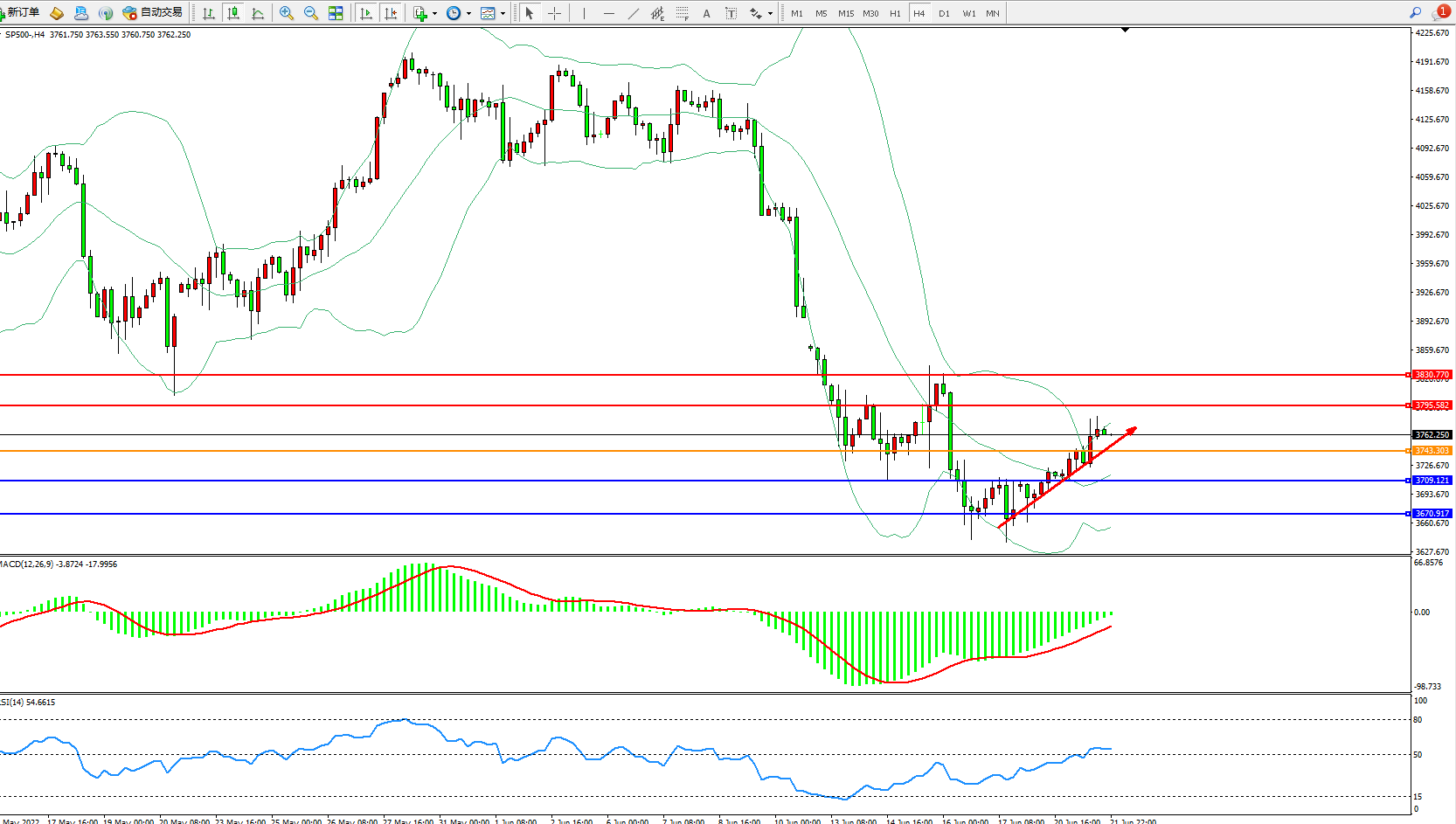 标普SP500——4小时K线图显示: