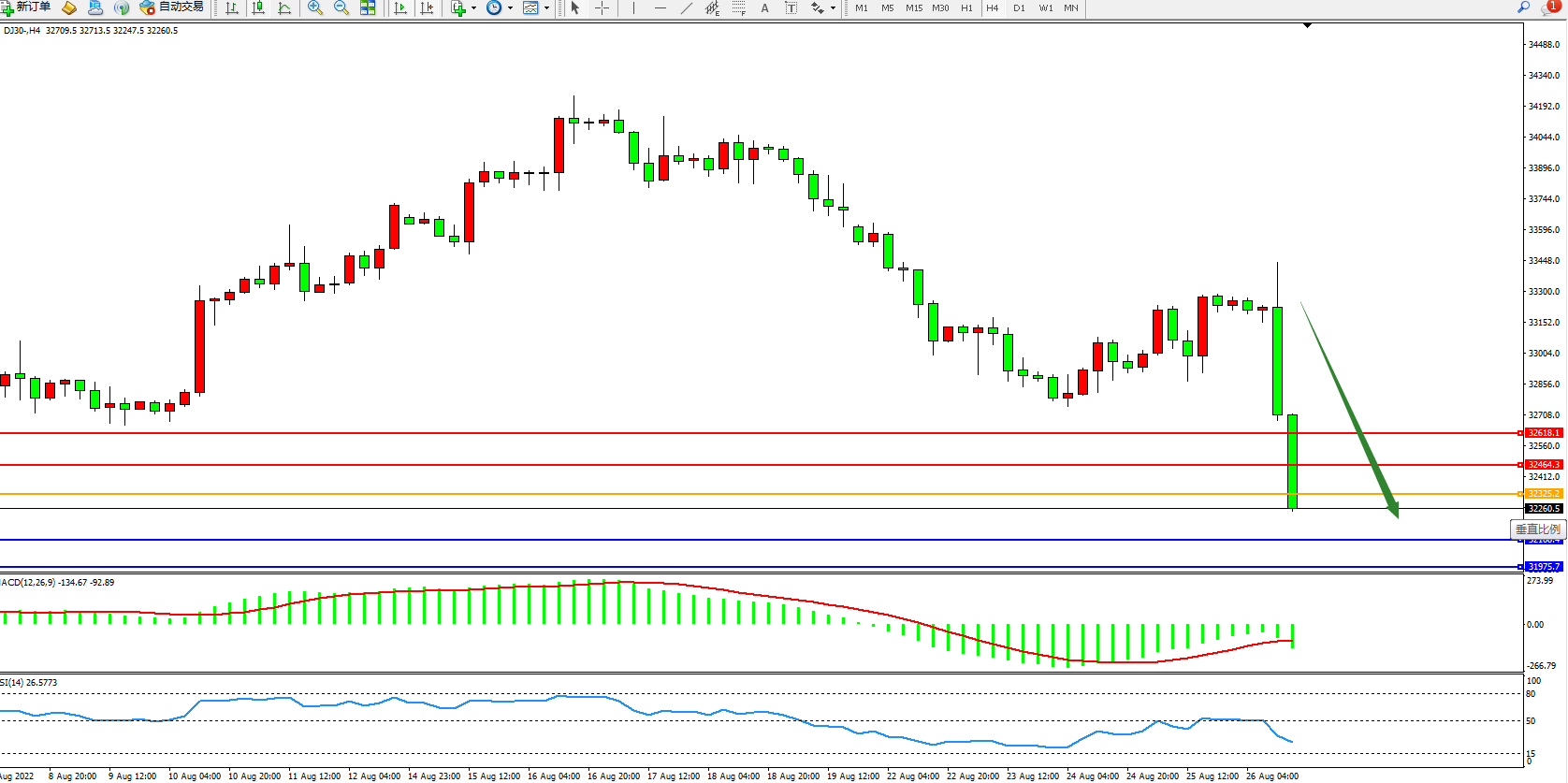 道琼斯指数DJ30——4小时K线图显示: