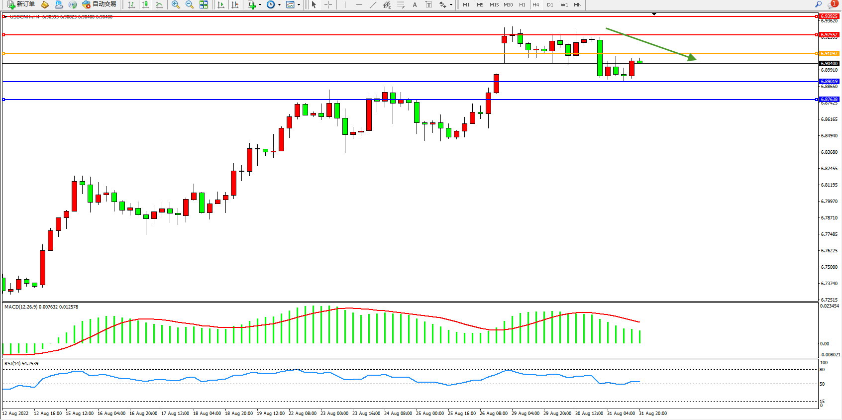 美元人民币USDCNH——4小时K线图显示:
