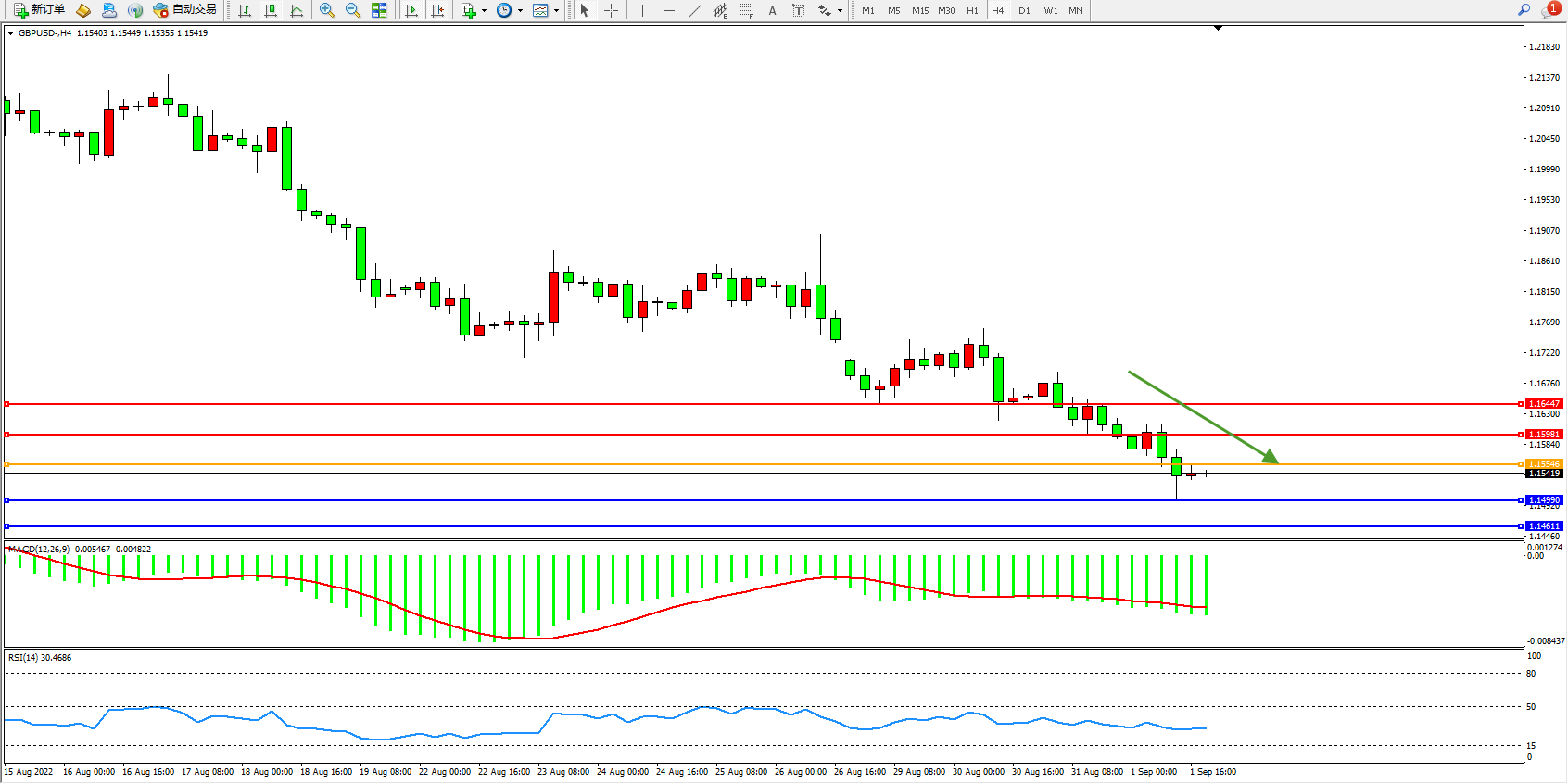 交易策略:1.15546下方看跌,目标1.14990、1.14611