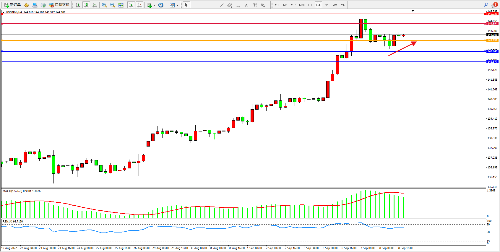 交易策略:143.757上方看涨,目标144.694、145.236