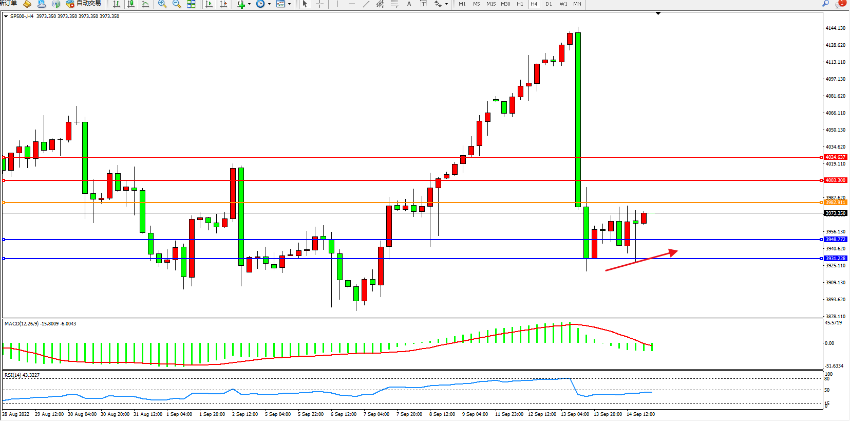 标普500指数9月14日(周三)收盘上涨13.52点,涨幅0.34%,报3946.21点;由于美联储在抑制价格压力和确保中期通胀预期稳定方面仍有大量工作要做,因此可以认为,FOMC目前还不会准备放弃其鹰派立场。由于这将影响风险资产,美元走强的风险将持续到明年年初。