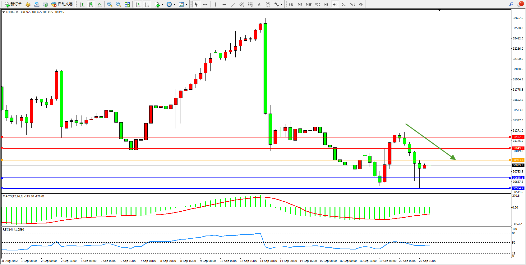 道琼斯指数DJ30——4小时K线图显示: