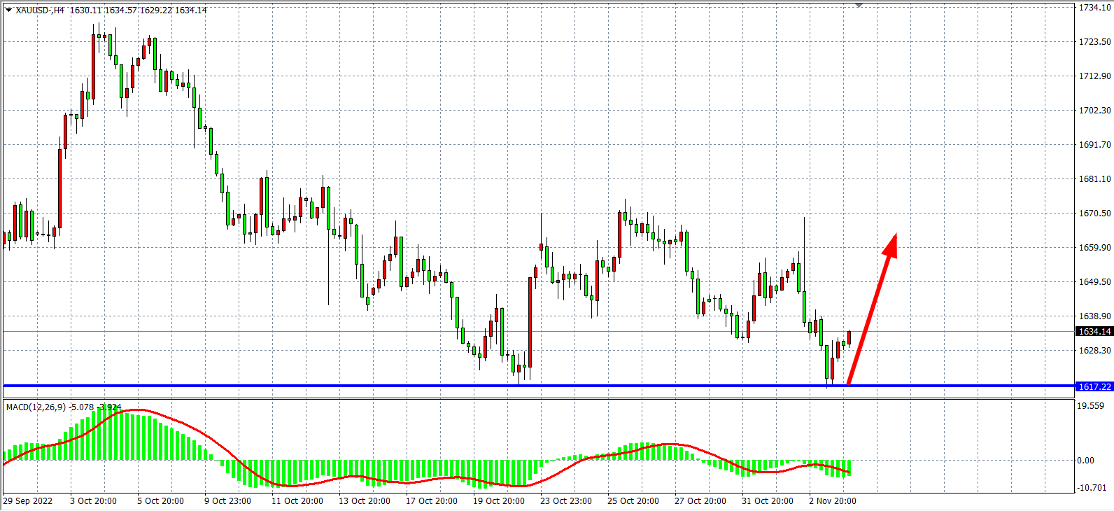 4小时图看,金价最低跌至1617附近随后大幅反弹,再度显示该位支撑力度强劲,同时MACD于零轴之下开始缩量,预示多头动能有走强迹象,日内以1617为强支撑看反弹,上方目标1640-1660。