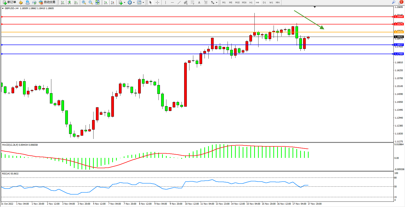交易策略:1.18926下方看跌,目标1.18037、1.17400