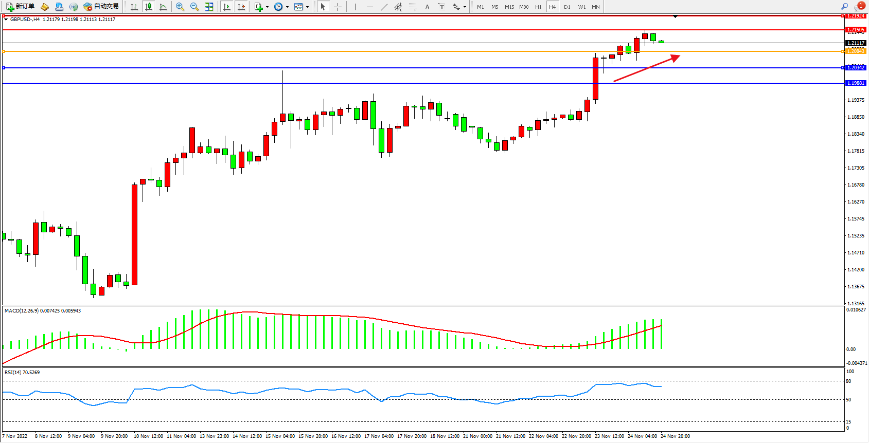 交易策略:1.20843上方看涨,目标1.21505、1.21924