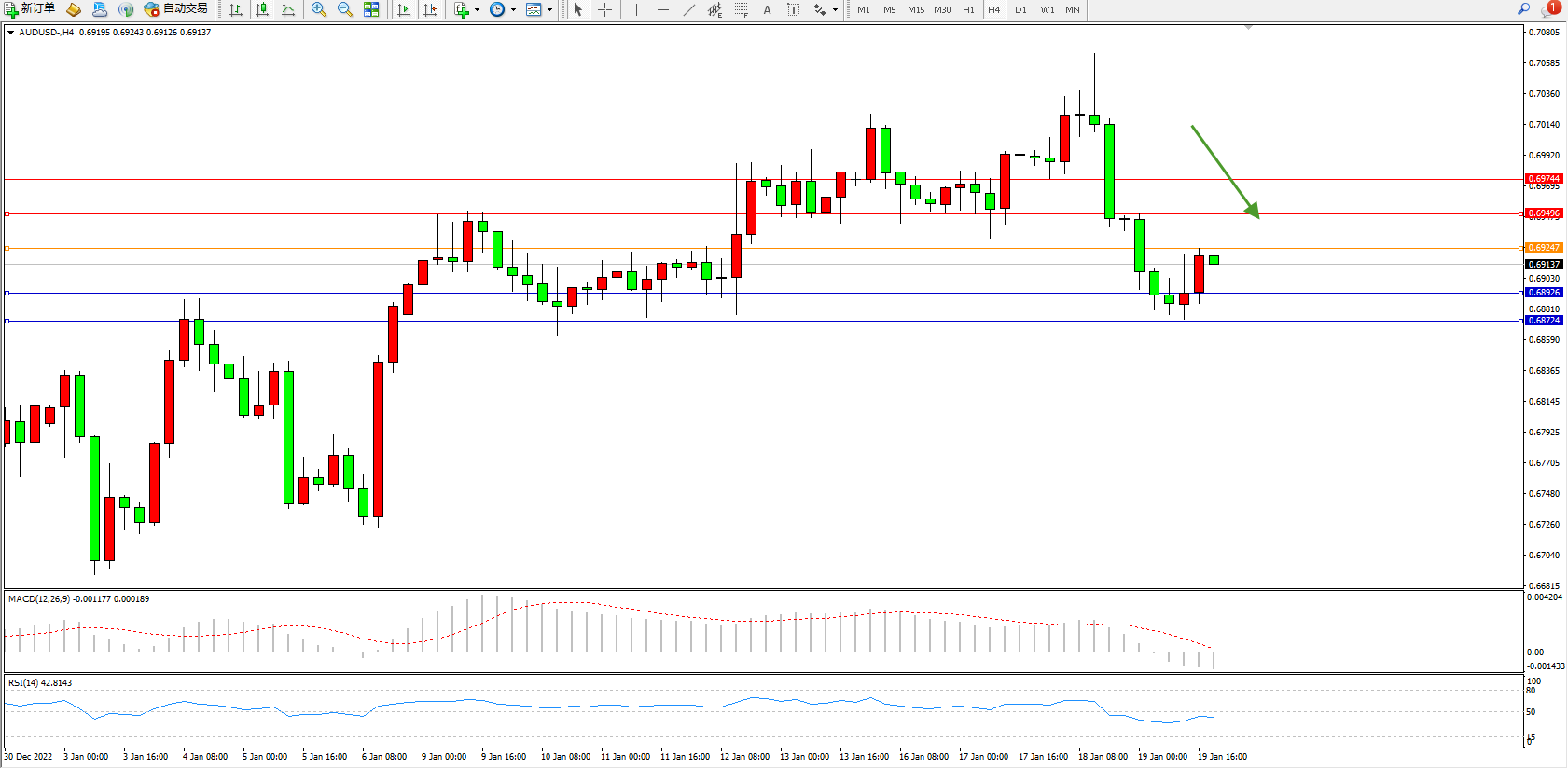 交易策略:0.69247下方看跌,目标0.68926、0.68724