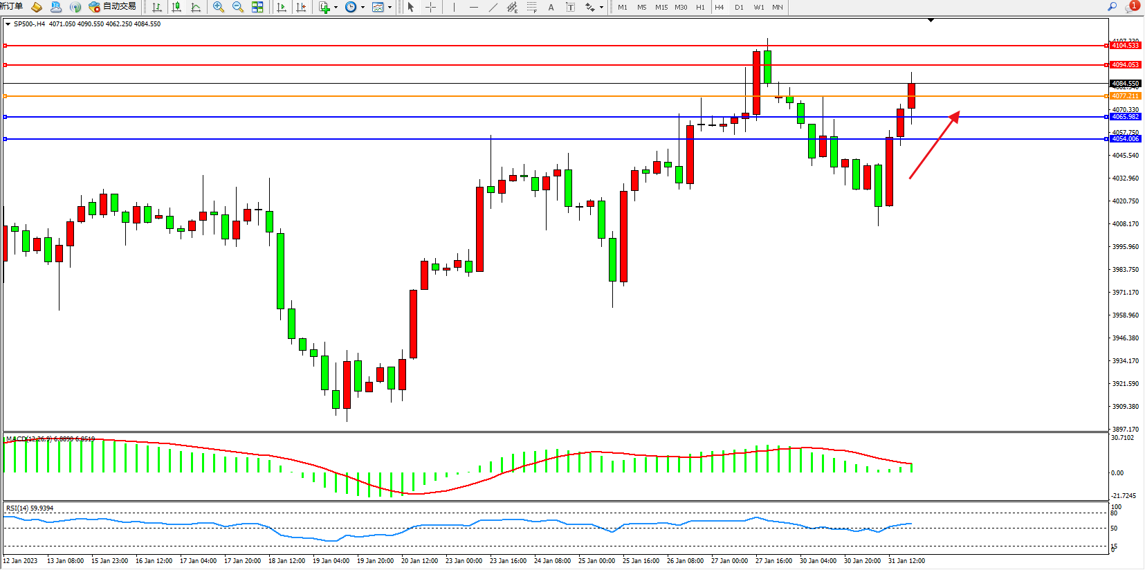 标普SP500——4小时K线图显示: