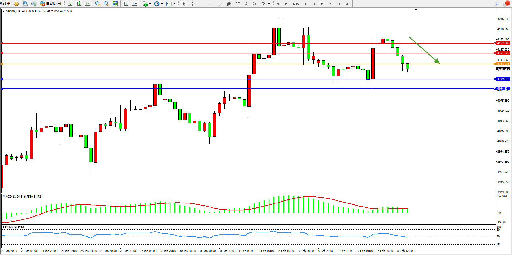 标普SP500——4小时K线图显示: