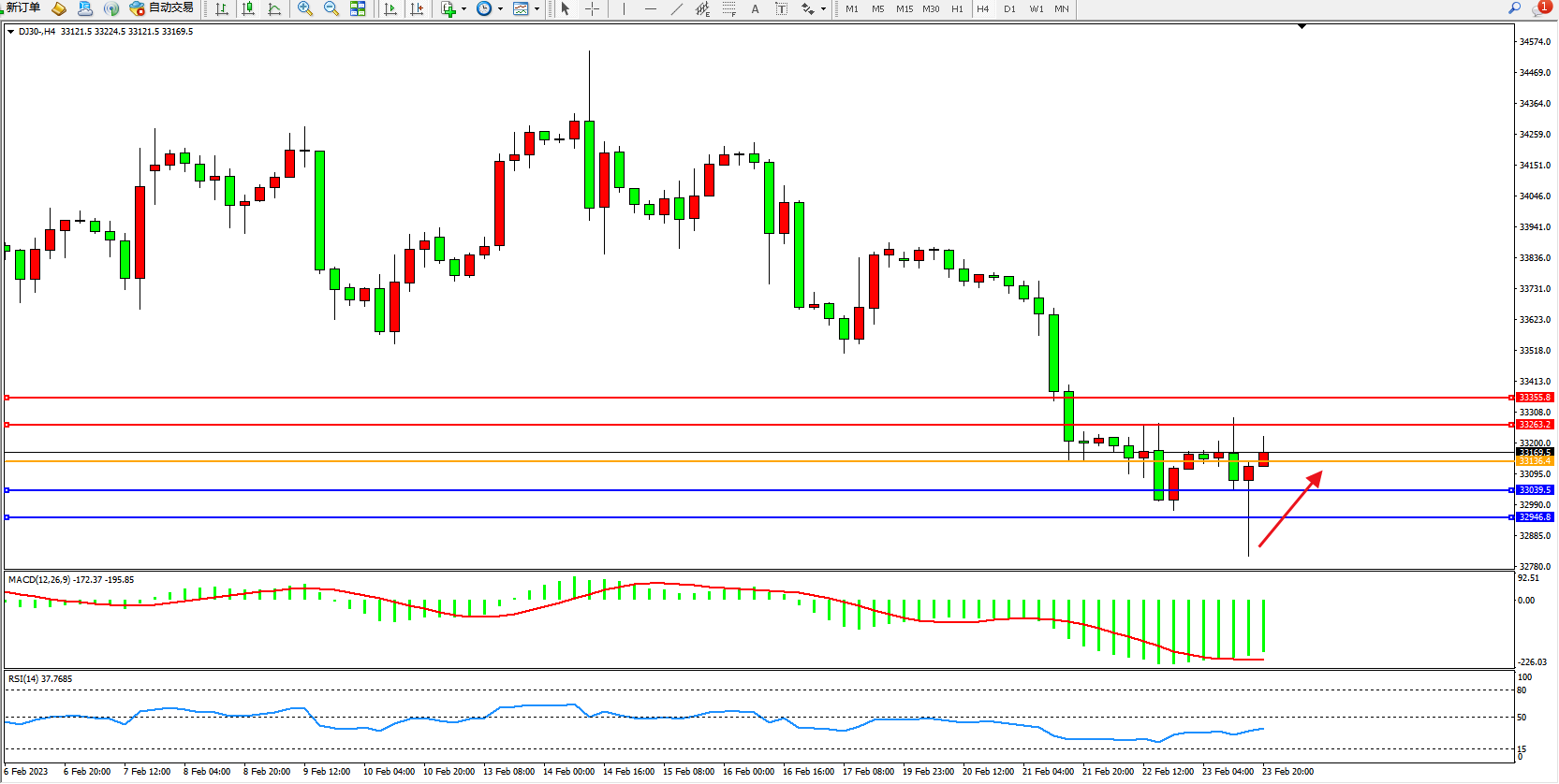 道琼斯指数DJ30——4小时K线图显示: