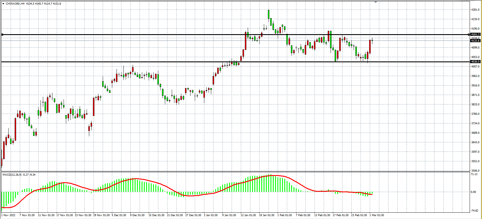 4小时图看,沪深300在4030附近支撑企稳后继续开启反弹,同时MACD于零轴之下缩量,行情有望出现上攻,当前走势于4030-4160形成箱体,若上破4160后市有望打开上行空间,上方看4250-4300附近。