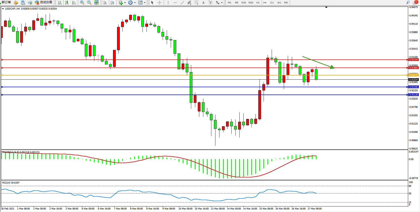 美元瑞郎USDCHF——4小时K线图显示: