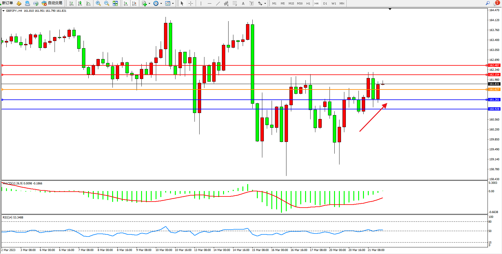 4小时图看:多头动力震荡上行,短期看涨情绪涌现,市场多头不断向上移动中MACD指标处于空头区域维持整理上移至0轴线附近徘徊,RSI指标处于50均衡线附近弱势整理;