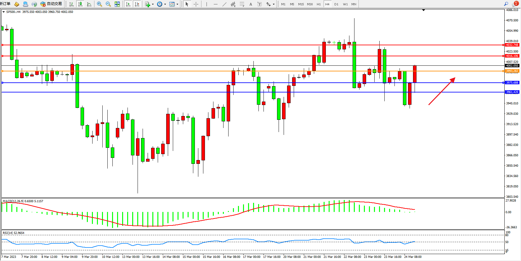 标普SP500——4小时K线图显示: