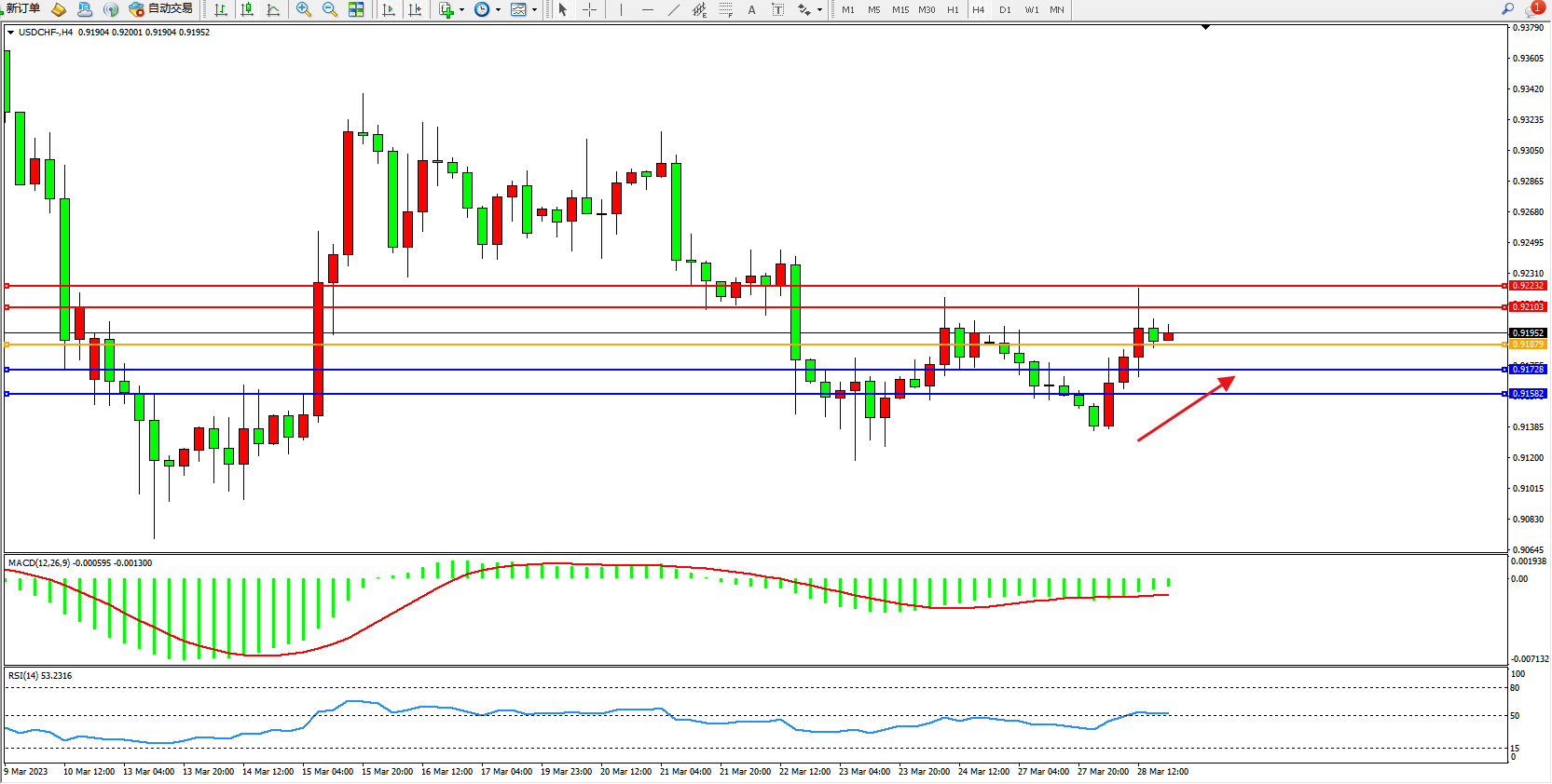 交易策略:0.91679上方看涨,目标0.92103 0.92232