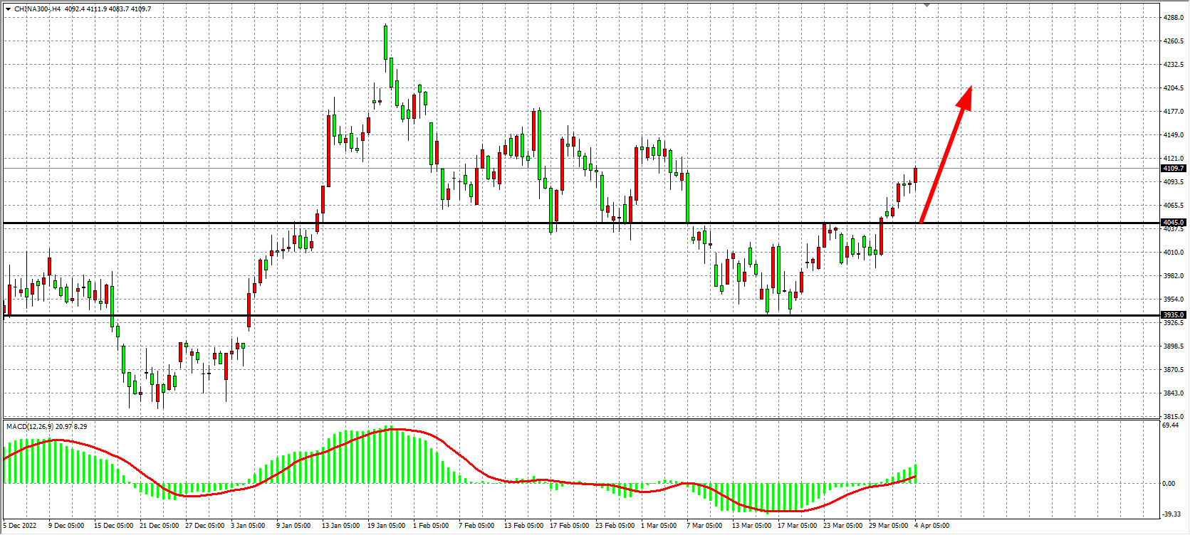 4小时图看,沪深300在4050之上进一步走高,且突破4100一线,总体走势较强,同时MACD开始整齐放量,当前支撑继续关注4050,该位之下继续看4150-4200附近。