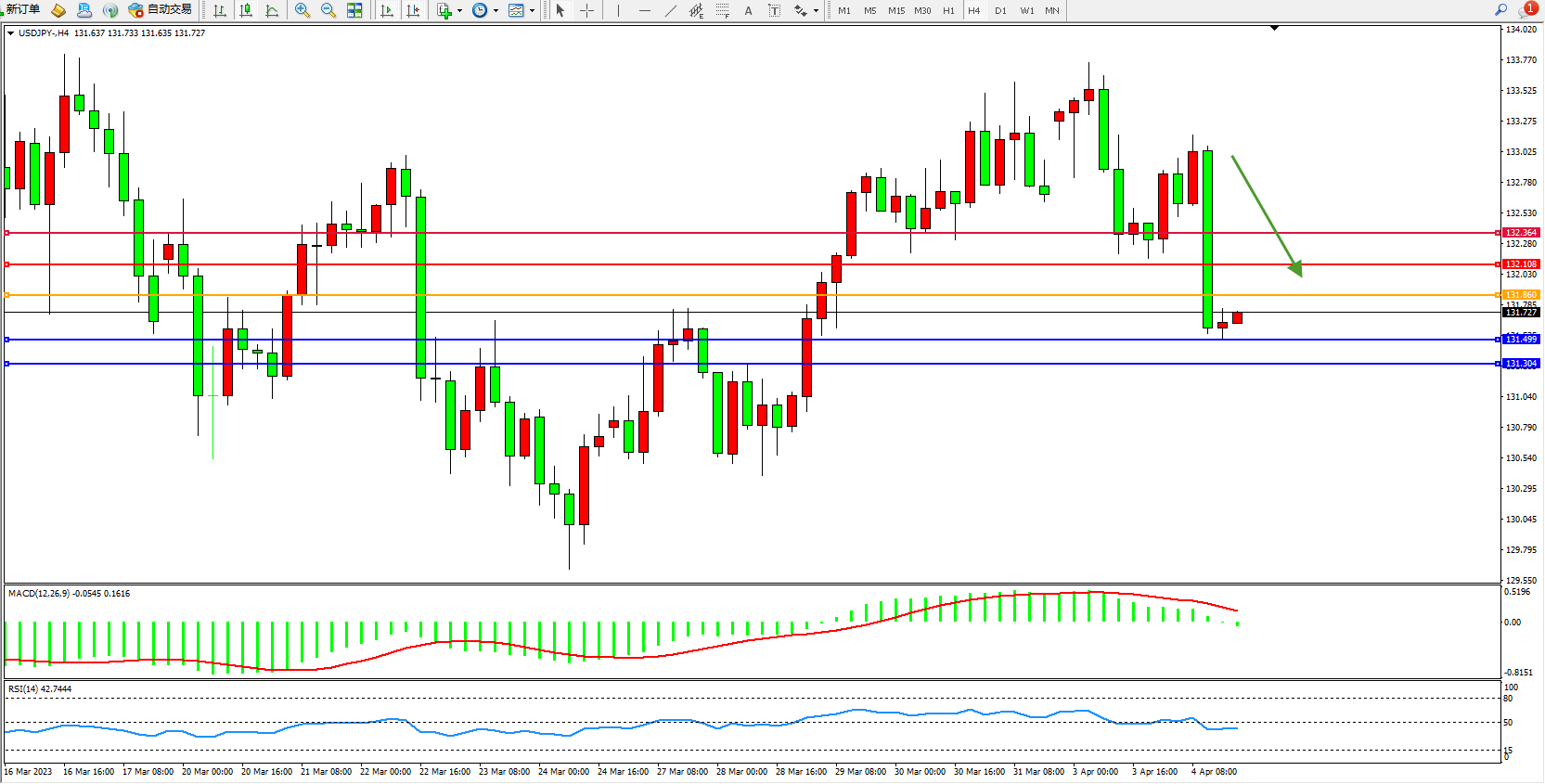 交易策略:131.860下方看跌,目标131.499 131.394
