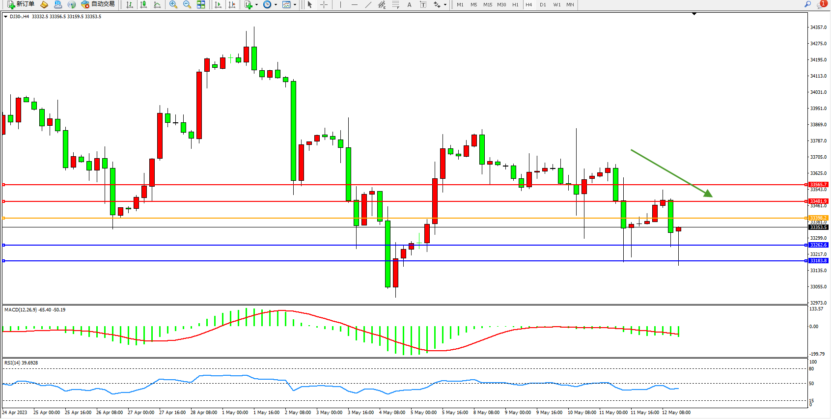 道琼斯指数DJ30——4小时K线图显示: