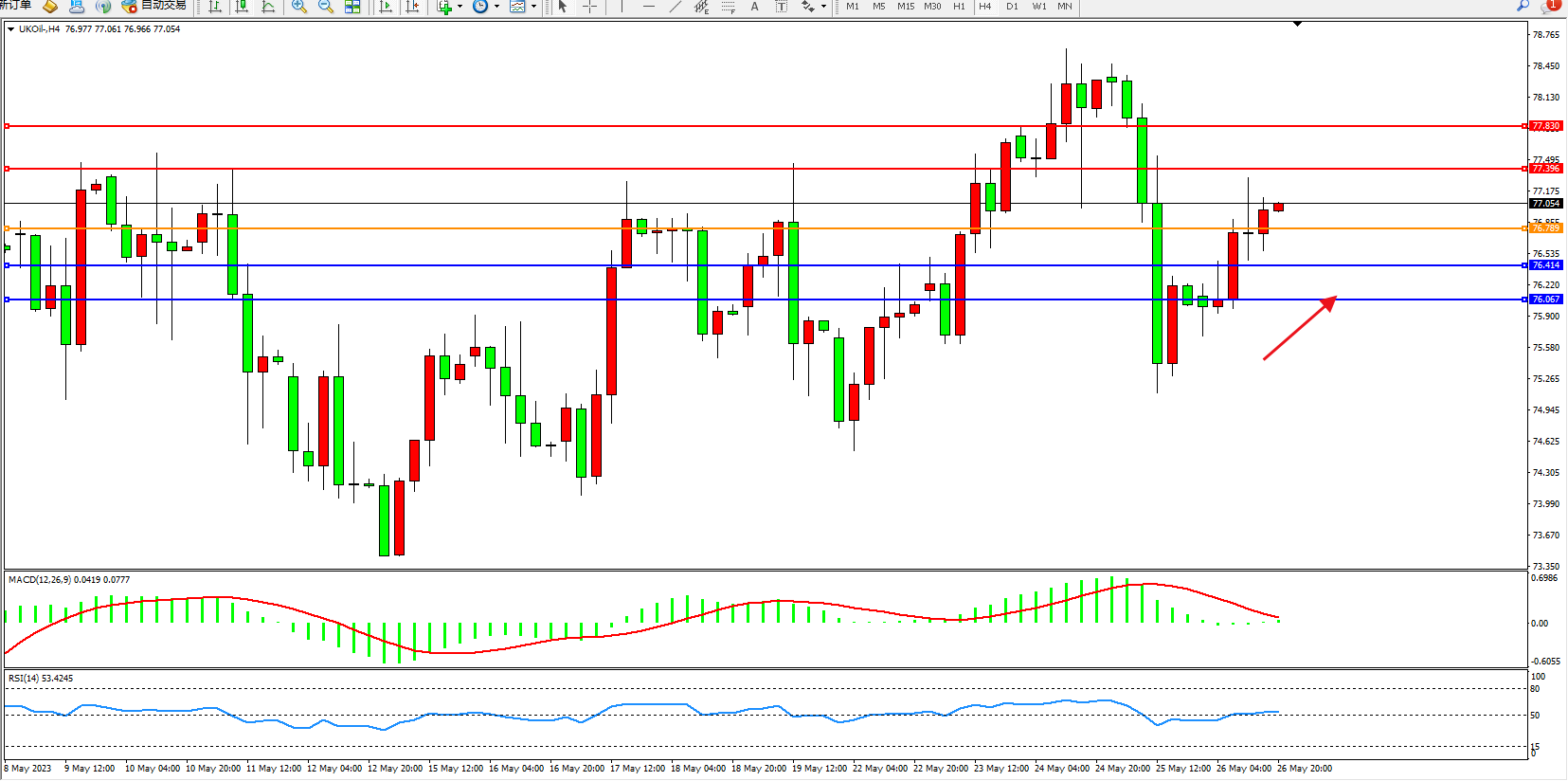 交易策略:77.054上方看涨,目标77.396  77.830