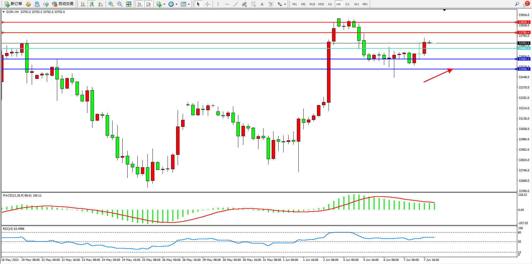 道琼斯指数DJ30——4小时K线图显示: