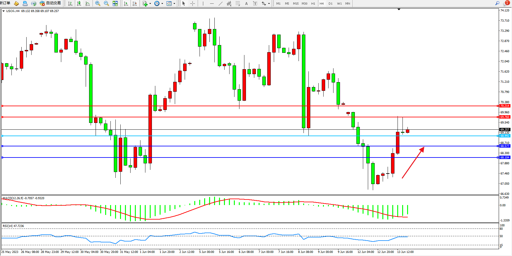 交易策略:68.992上方看涨,目标69.760  70.214