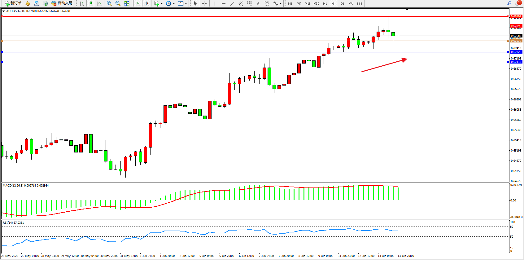 阻力位:0.67896  0.67102