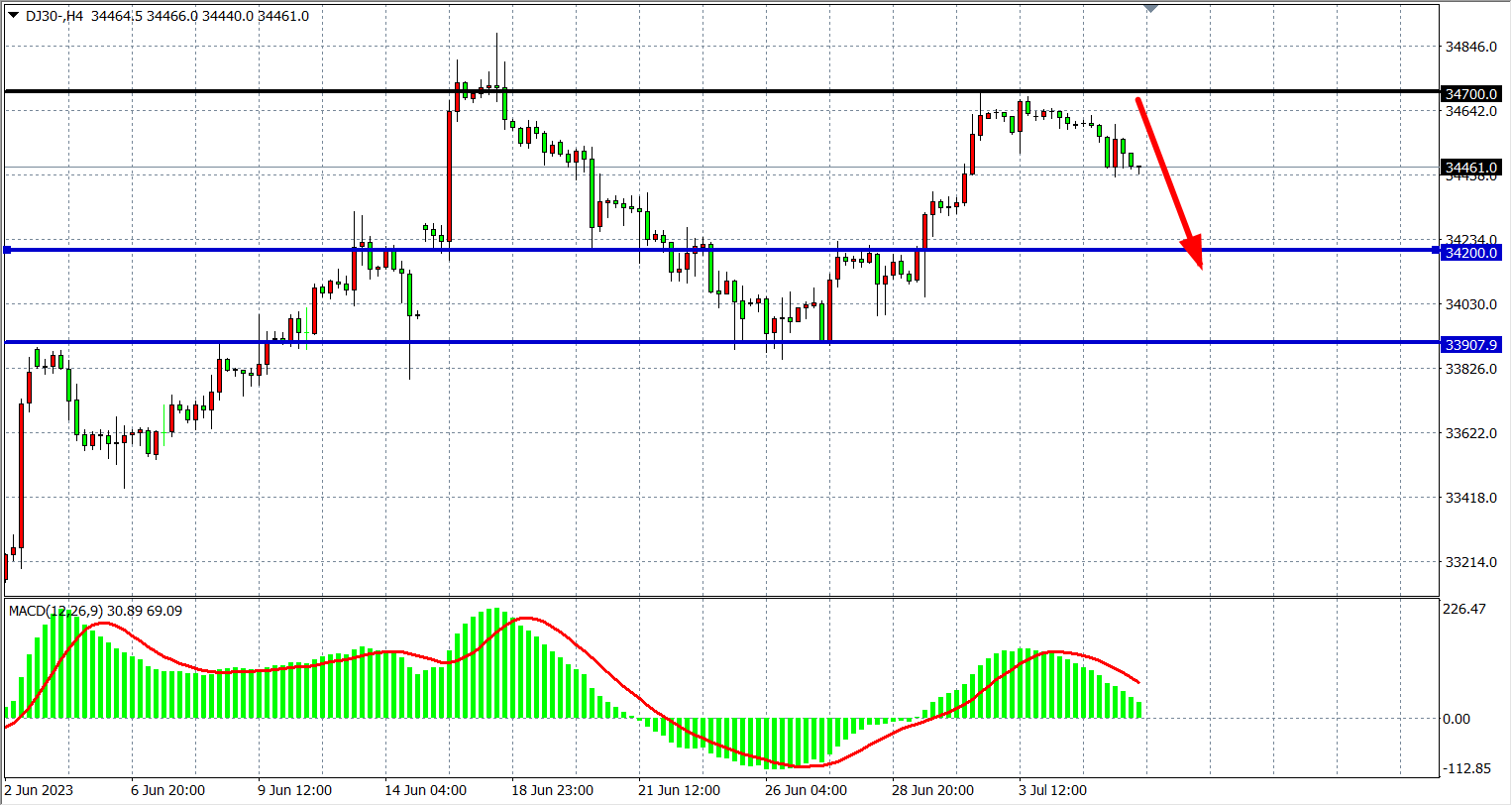 4小时图看,道指反弹34700一线后受阻回落,MACD量能在零轴上缩量,下方支撑34200-33900,上方阻力34700-35000。