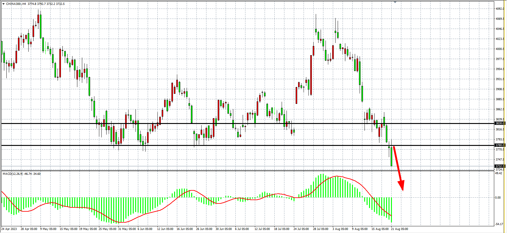 4小时图看,沪深300在3800之下继续走低,MACD量能在零轴下走强,压力关注3780附近,下方支撑关注3700-3670。