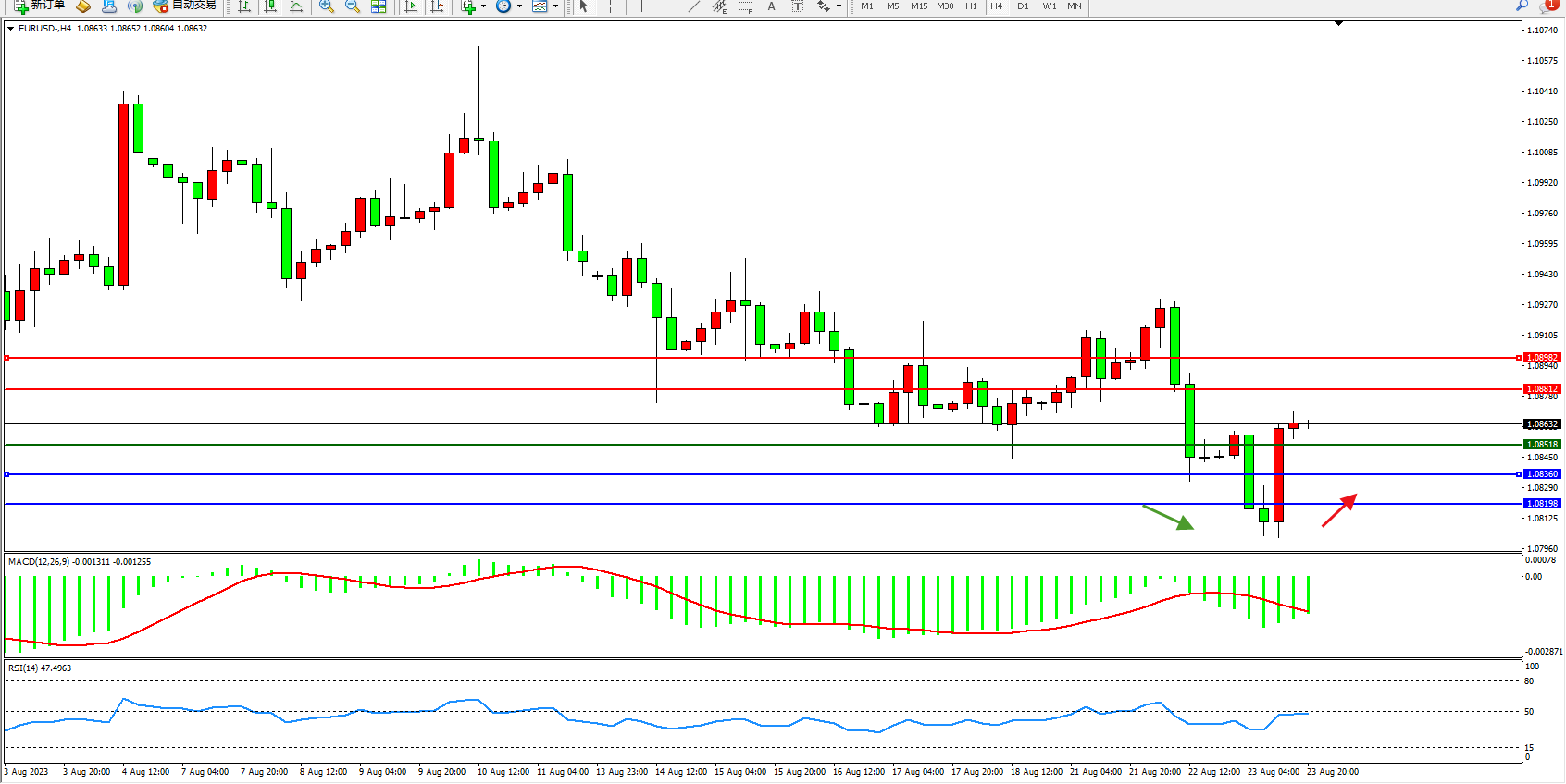 4小时图看:低位V型反转上扬,短期看涨情绪持续,市场多头动力不断涌现,MACD指标处于空头区域维持震荡,RSI指标处于50均衡线附近徘徊;