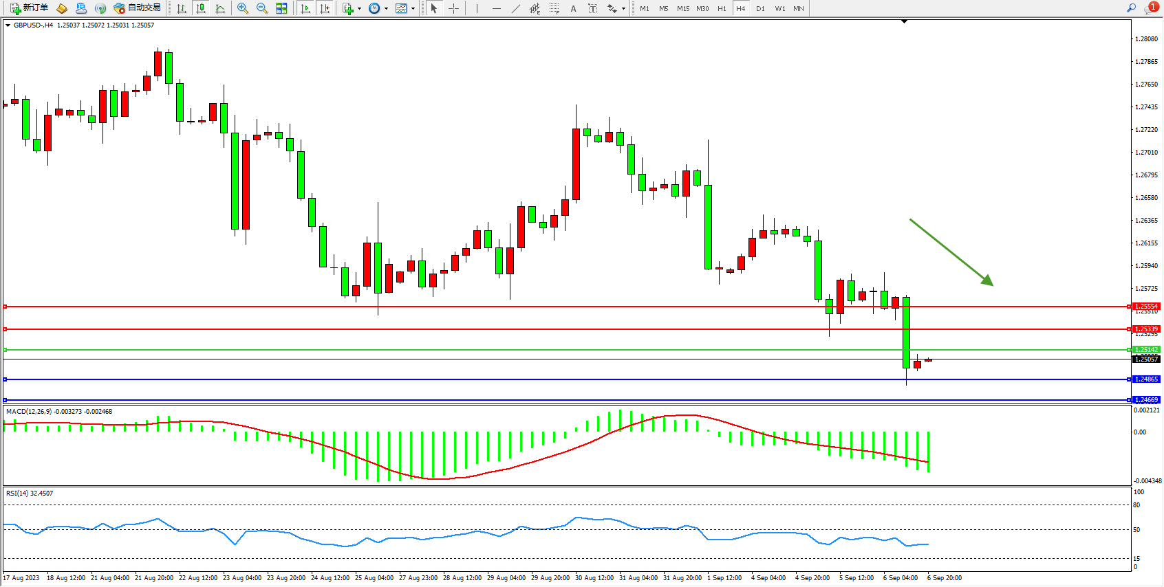 4小时图看:市场空头情绪笼罩,短期呈阶梯式震荡向下移动,且未见有止步迹象,MACD指标指标处于空头区域持续下行,RSI指标处于空头区域维持震荡;