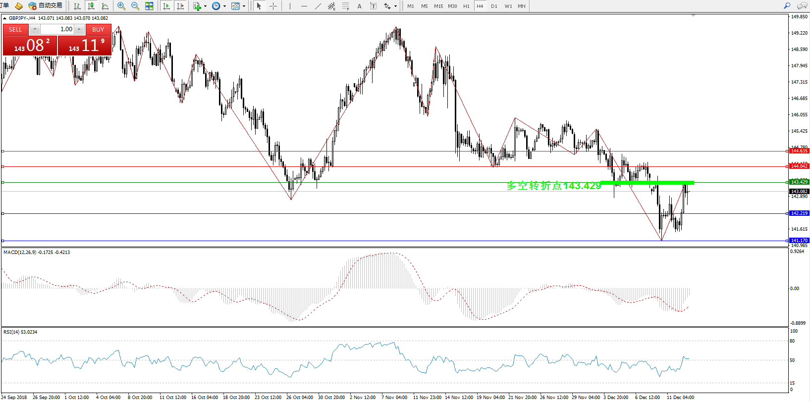 备选策略:143.429下方看跌,目标142.219、141.170