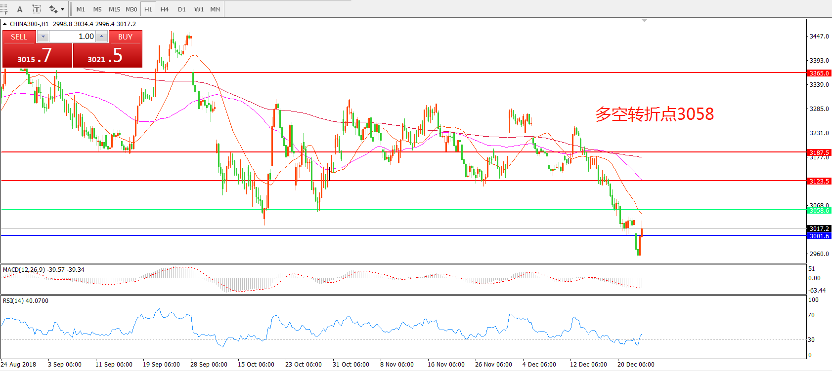 1小时图看,CHINA300中华指数虽触及3000支撑附近有所反弹,但整体走势依旧偏弱,均线系统呈空头排列, MACD绿柱增加,RSI持有拐头迹象,短线依然看空