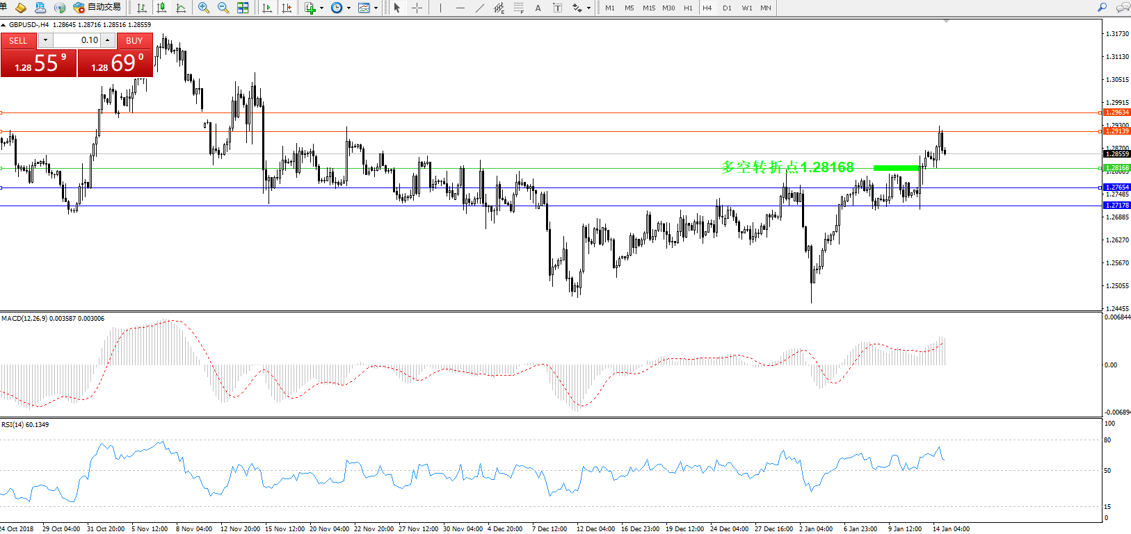 交易策略:1.28168上方看涨,目标1.29139、1.29634