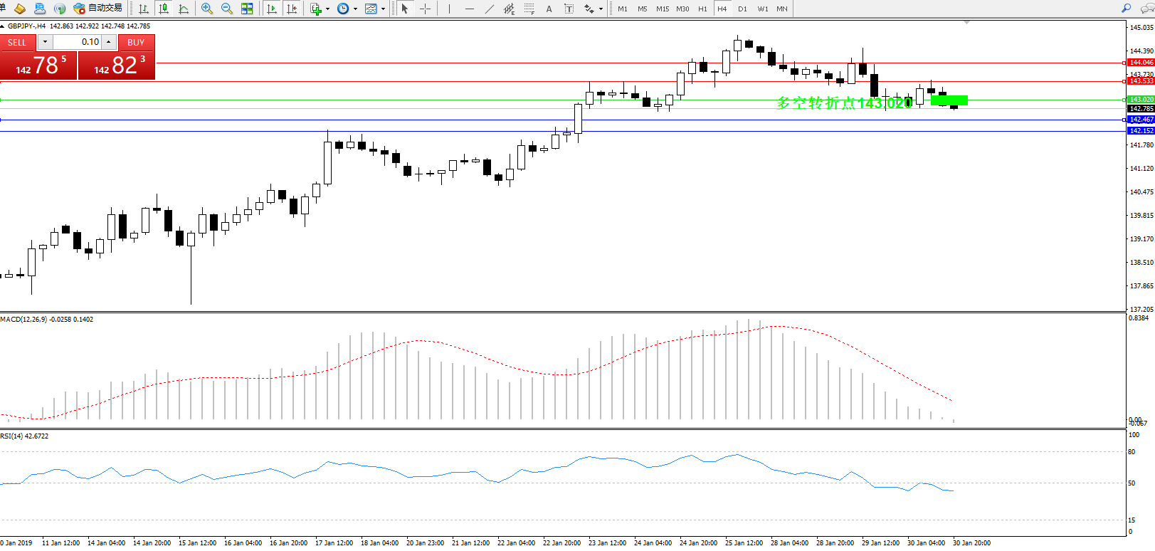 交易策略:143.020下方看跌,目标142.467142.152