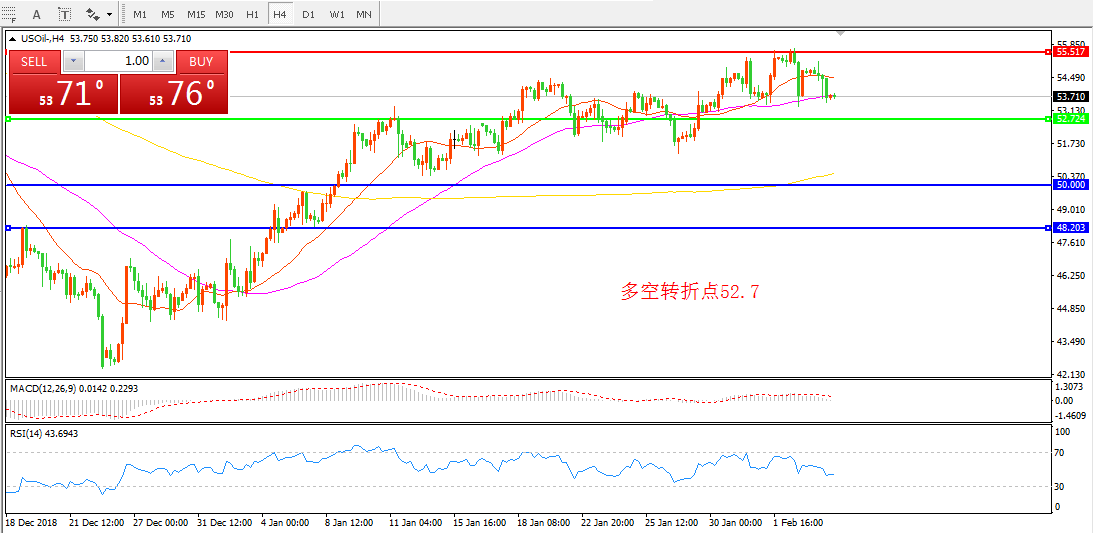 4小时图看,油价强势突破55美金后回落,目前险守于55均线的附近, MACD红柱缩减,RSI拐头向下,短期内重点关注52一线支撑。