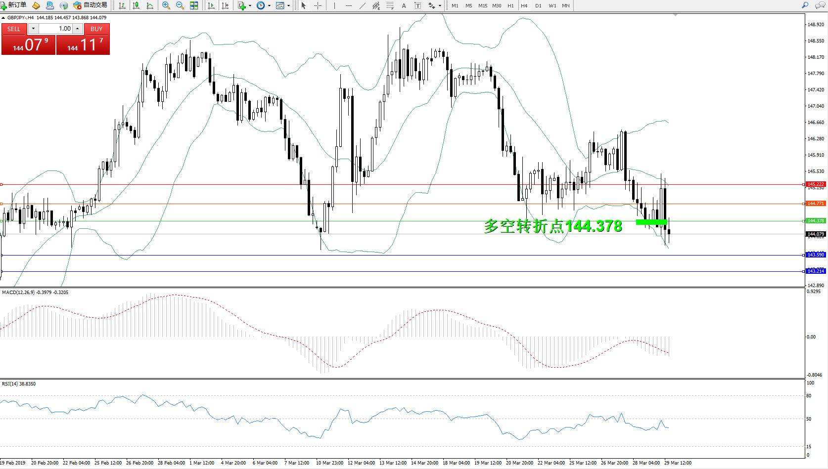 备选策略:144.378上方看涨,目标144.771、145.222
