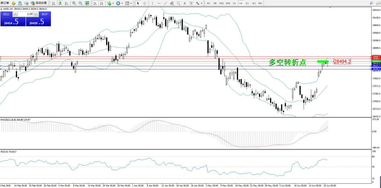 香港恒生指数6月21日(周五)收盘下跌76.72点,跌幅0.27%,报28473.71点;恒指上周五微幅收跌;累计涨幅约5%,创去年10月29日以来最佳单周表现。市场早前已消化了利淡消息,倘若接下来没有其它利好催化因素或重大利空的因素,短期恒指或将保持这一态势在高位调整。港股昨日延续近期升势,并突破28,500点水平。自踏入本周后,港股累积升幅已达1,432点,表现之强令笔者亦感到意外。由于美股继续炒作减息因素而显著上扬,若今日A股及人民币仍有好表现,港股或有机会继续造好,笔者对后市看法仍审慎,若恒指进一步上试29,000点水平。