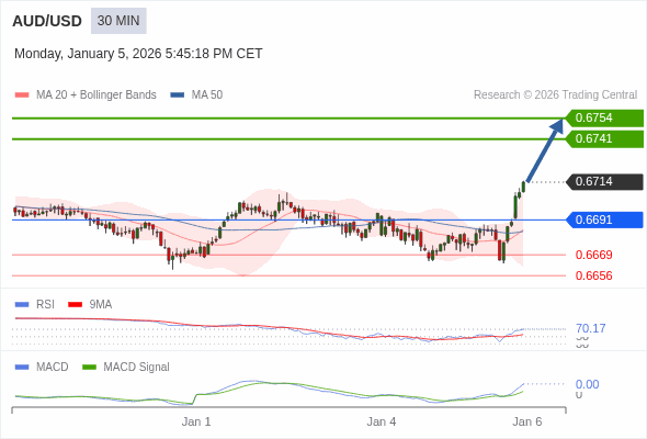 澳元/美元 当日内 : 看涨,当 0.6691 为支撑位。