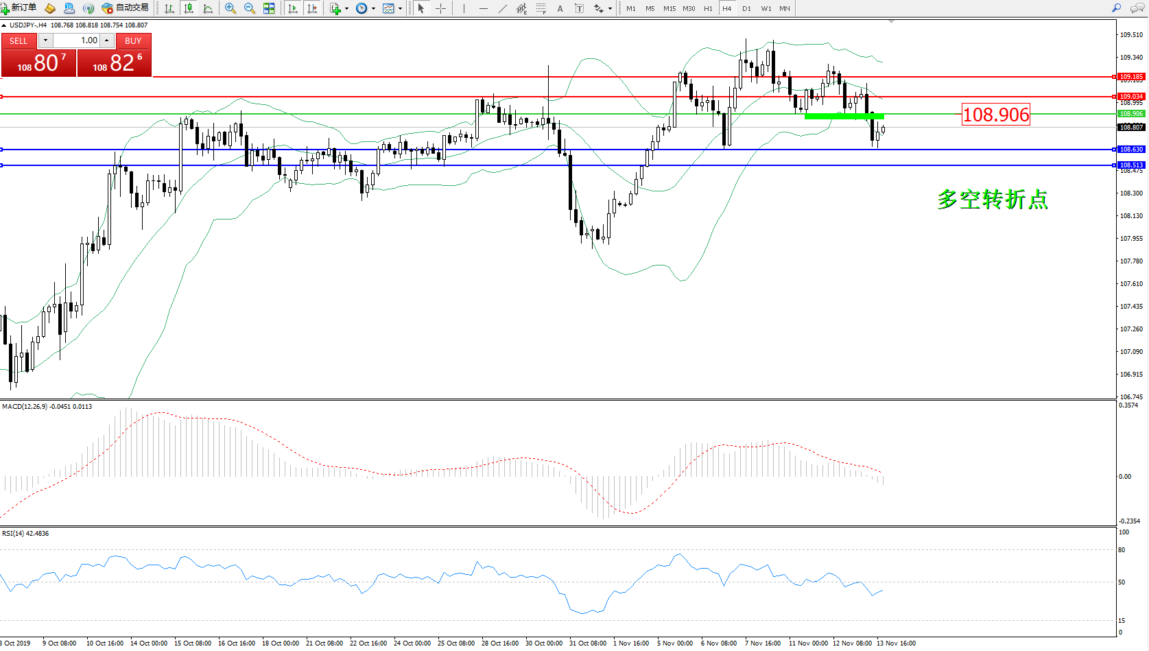 交易策略:108.906下方看跌,目标108.630108.513