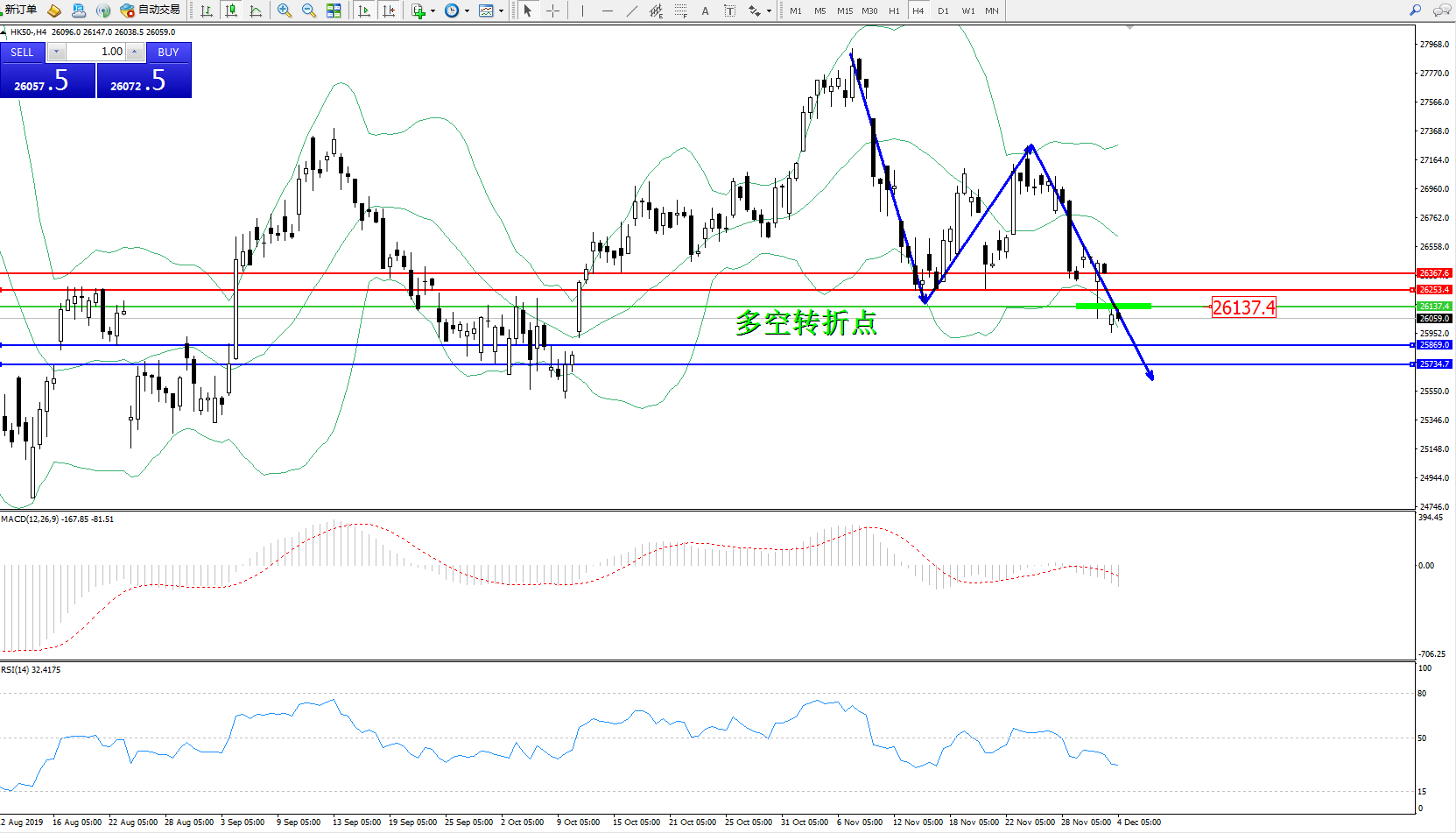香港恒生指数12月4日(周三)收盘下跌328.74点,跌幅1.25%,报26062.56点;受累美股急挫,昨晚夜期率先跟跌,再破26000关口,低见25949,最多跌432点,收市前重上26059收。恒指早上亦跟随大幅低开,再跌穿26000关口,低见25995。美国总统特朗普最新言论令投资者担忧贸易局势可能继续恶化,且市场恐慌程度的CBOE波动率指数(VIX)大涨,市场担忧情绪升温,近日恒指稍呈弱势,持续在26000附近横新,更受外围消息主导,投资者也不敢过份进取。
