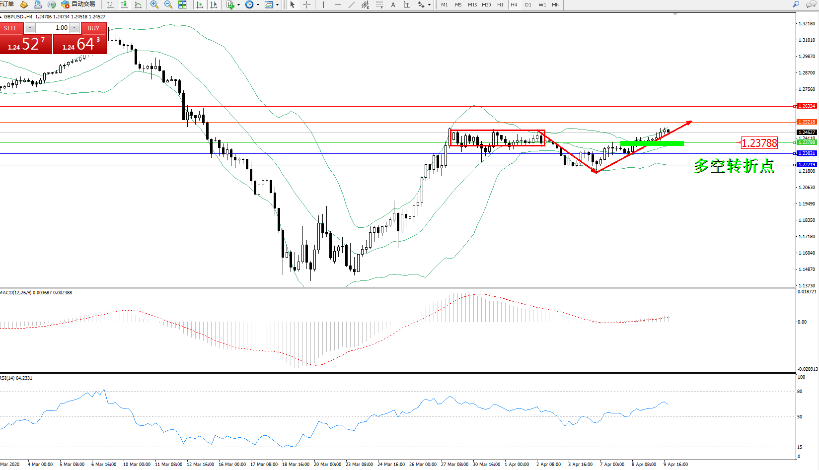 交易策略:1.23788上方看涨,目标1.25218、1.26334