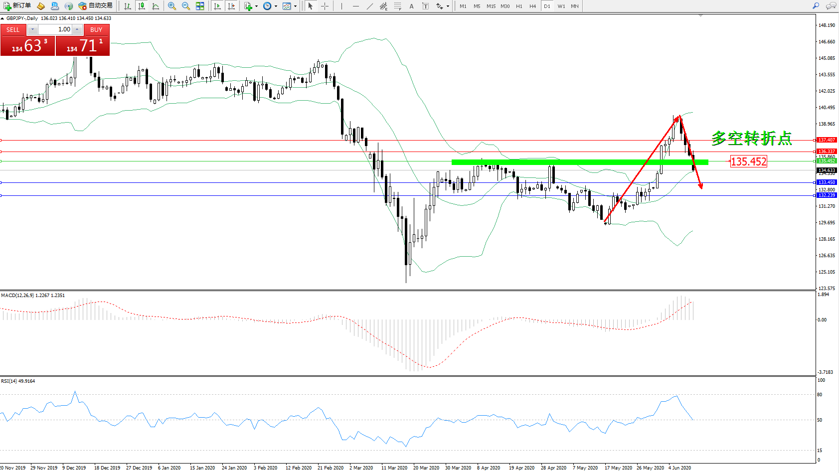 交易策略:135.452下方看跌,目标133.450132.239