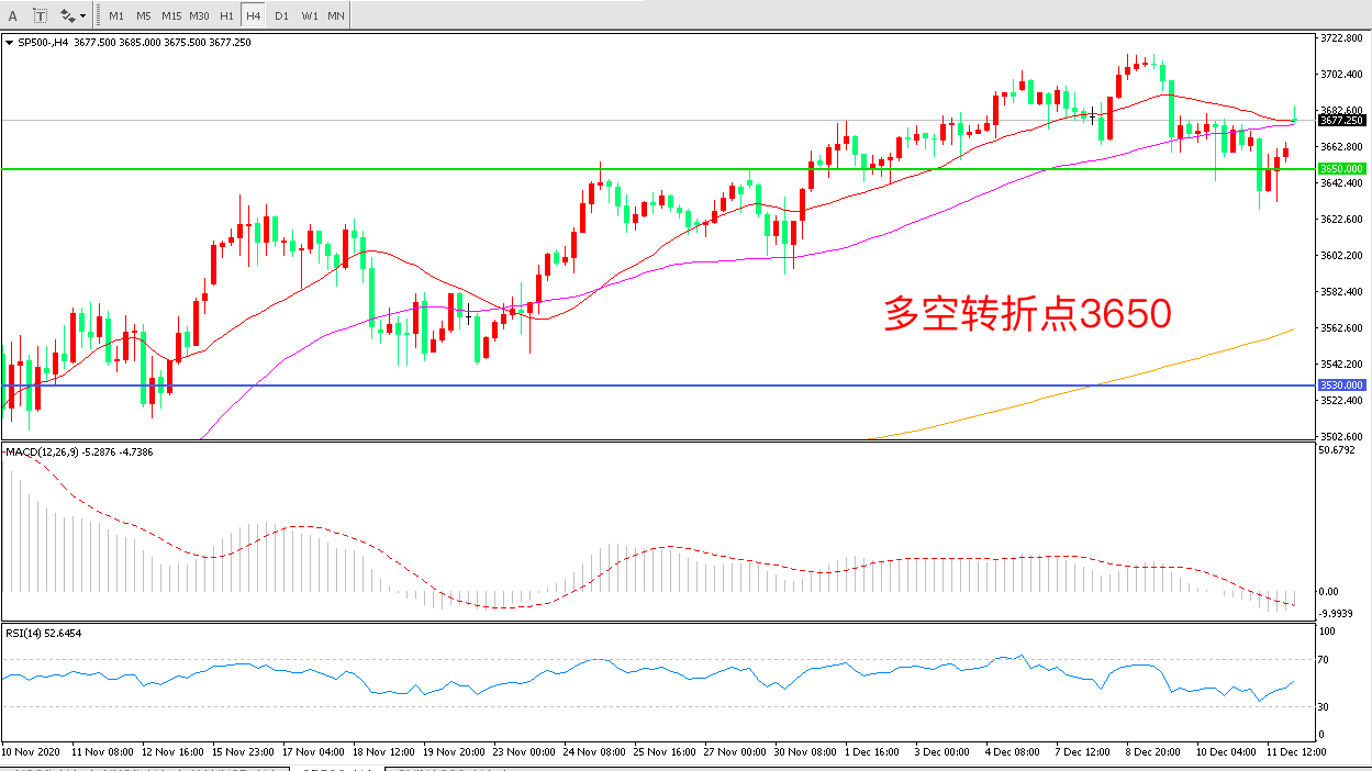 4小时图看,标普500高位震荡后长阴下坡短期涨势遭到破坏短期均线拐头向下3650成为短期支撑 MACD红柱减少绿柱增加RSI指标走平,日内延续震荡概率较大